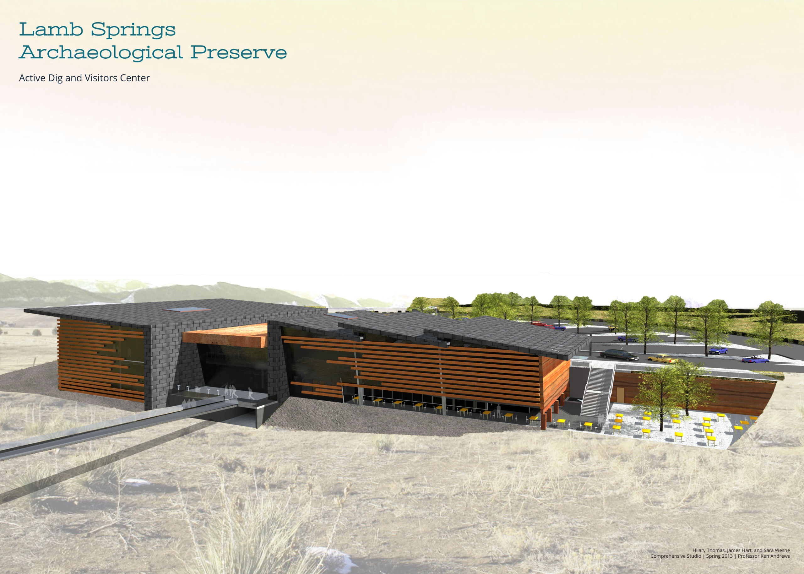 Challenges: Since the Lamb Spring site is an active archeological dig, one central challenge was to provide security, shade, and basic support services at the dig site, while avoiding ground penetrations which could damage undiscovered artifacts. In response I proposed a relocatable pavilion and a bridge that spans between the visitor’s center and the dig site pavilion. The bridge is held in tension by a counterweight in the visitor’s center, so that the entire cable-supported walkway to the dig structure can avoid touching the ground. As the dig moves around the site, the museum staff can raise the counterweight to release the tension on the bridge, relocate the dig structure, and then lower the counterweight to restore the bridge tension.